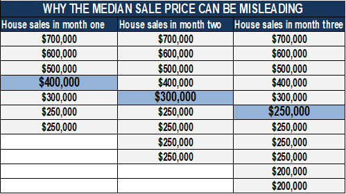 This table shows you how the median price (shown in blue) measures the middle point of all sales.