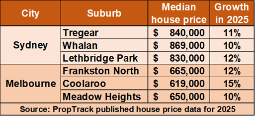 House prices grew by over 10% during 2025 in Sydney’s outer locations such as Blacktown, Penrith and Campbelltown. Median house prices in those areas, however, are around $850,000, well below Sydney’s median house price of $1,700,000.